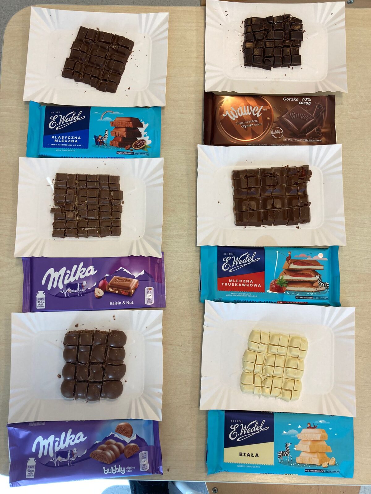 🍫🍫 Są takie dni w roku, na które dzieci czekają z niecierpliwością – urodziny, Dzień Dziecka, Święta Bożego Narodzenia, bo przychodzi Mikołaj, Święta Wielkanocne, ponieważ kica do nich Zajączek i do tych dni zaliczyć możemy również Dzień Czekolady, bo właśnie tego dnia prawie wszystkie diety i zakazy odchodzą w niepamięć 😉 Dziś z okazji Dnia Czekolady nasze Przedszkolaki poznały tajniki tej pyszności wieloma zmysłami – wzrokiem, dotykiem oraz smakiem 🙂 ten ostatni cieszył się największym powodzeniem 🍫🍫