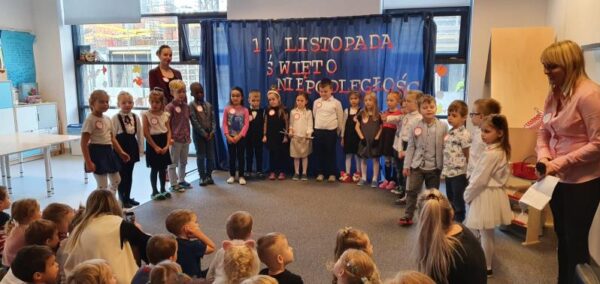 Dzień Niepodległości Z okazji Święta Niepodległości dzieci z grupy Jelonków pod kierunkiem Pań przygotowały piękną akademią tematyczną przedszkolaków. Po niej wspólnie wzięliśmy udział w akcji „Szkoła do Hymnu” i wspólnie obok przedszkola zaśpiewaliśmy „Mazurka Dąbrowskiego”.