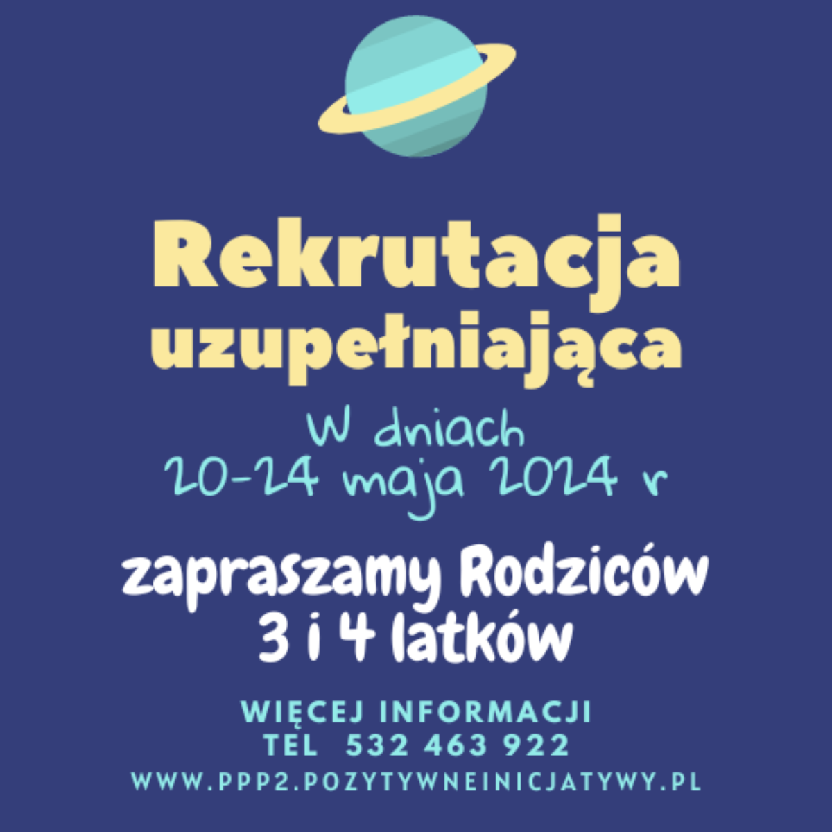 W dniach 20-24 maja br trwać będzie rekrutacja uzupełniająca. Zapraszamy Rodziców 3 i 4 latków (rok urodzenia 2021 i 2020). Więcej informacji można odnaleźć tutaj